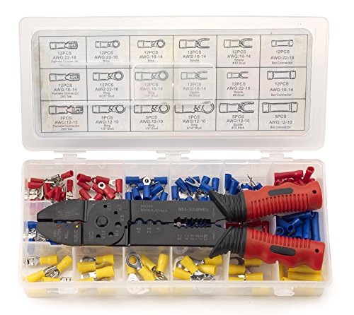 Essential shop kit for auto and home electrical repair. 175 insulated terminals and connectors-no soldering required! Most commonly used sizes. Assorted ring terminals, spade terminals, splice connectors, male and female quick-connects. Includes sized-wire stripper, cutter and crimping tool with PVC handles and see-thru organizer case. Contents include 53pc spade terminals:12pc 22-16AWG, 36pc 16-14AWG, 5pc 12-10AWG 63pc ring terminals: 24pc 22-16AWG, 24pc 16-14AWG, 15pc 12-10AWG 29pc butt connectors: 12pc 22-18AWG, 12pc 16-14AWG, 5pc 12-10AWG 29pc female connectors: 12pc 22-18AWG, 12pc 16-14AWG, 5pc 12-10AWG Also comes with a 9" wire crimping tool with double soft handle
